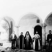 Groupe de popes non identifiés devant une église. Probablement une photographie de l'album de Joseph Laurent.