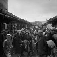 Groupe de trois femmes européennes dans un marché d'une ville de Bulgarie, peut-être le jour de la fête de l'indépendance bulgare, le 22 septembre. Photographie peut-être prise par Paul Perdrizet lors d'une excursion en marge du congrès international d'études byzantines de Sofia, en septembre 1934.